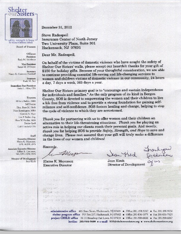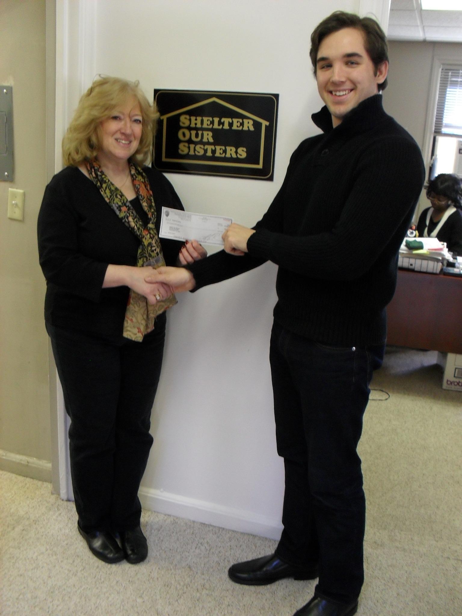 Pictured: ICNJ’s Personal Insurance Agent, Andrew Radespiel, handing a $150 check to Elaine K. Meyerson, Shelter Our Sister’s Executive Director.